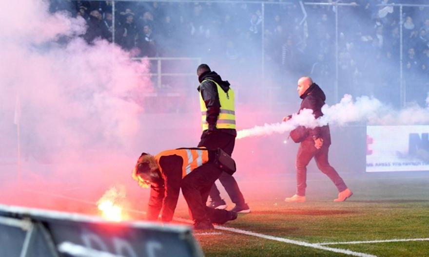 Οι οπαδοί του ΠΑΣ Γιάννινα παρά τις παραινέσεις που έγιναν από τα μεγάφωνα του γηπέδου., από την έναρξη του αγώνα επιδίδοντας σε συνεχείς ρίψεις κροτίδων και πυρσών, με άμεση συνέπεια να αναγκάσουν τον ρέφερι της αναμέτρησης Στέφανο Κουμπαράκη στην απόφαση να διακόψει προσωρινά το ματς.