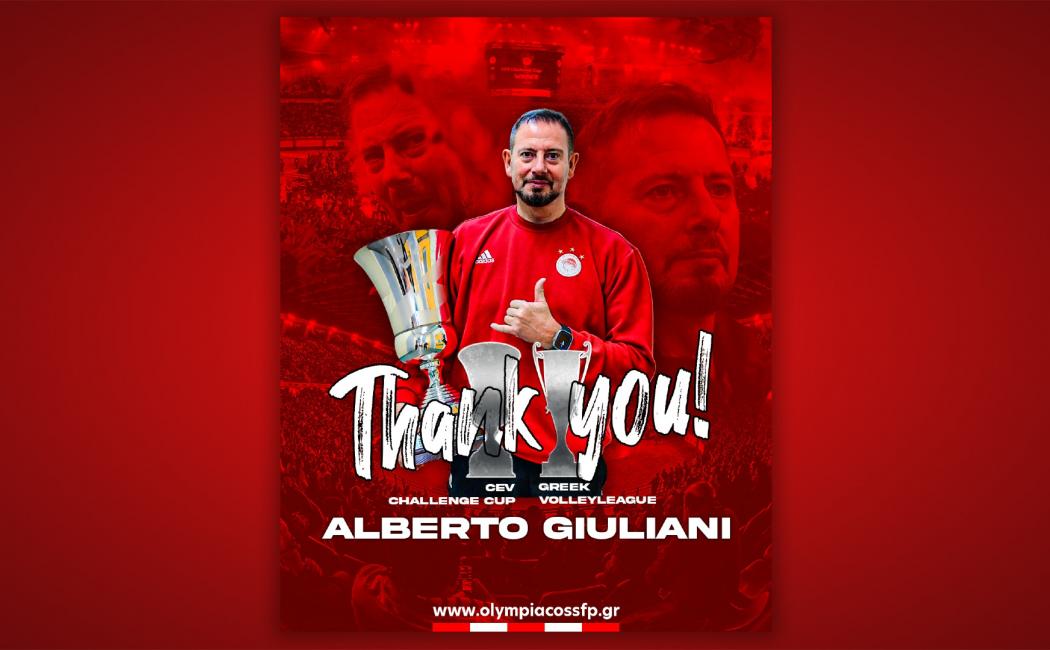 Ο ΟΛΥΜΠΙΑΚΟΣ Σ.Φ.Π. ανακοινώνει τη λύση της συνεργασίας του με τον Αλμπέρτο Τζουλιάνι. Ο Ιταλός τεχνικός, που ανέλαβε την τεχνική ηγεσία της ομάδας βόλεϊ Ανδρών του συλλόγου, τον Ιανουάριο του 2022, πρόσφερε στο σύλλογο μας σημαντικές επιτυχίες. Ο 59χρονος προπονητής οδήγησε τη φετινή σεζόν την ομάδα στον τρίτο της ευρωπαϊκό τίτλο, με την κατάκτηση του ChallengeCup στο κατάμεστο ΣΕΦ, ενώ κέρδισε και το πρωτάθλημα της VolleyLeague. Ο ΟΛΥΜΠΙΑΚΟΣ Σ.Φ.Π. ευχαριστεί θερμά τον Αλμπέρτο Τζουλιάνι και του εύχεται καλή επιτυχία στην καριέρα του.