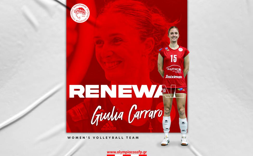Ο ΟΛΥΜΠΙΑΚΟΣ Σ.Φ.Π. ανακοινώνει την ανανέωση της συνεργασίας του με την Τζούλια Καράρο. Η Ιταλίδα πασαδόρος υπέγραψε το νέο της συμβόλαιο και παραμένει στο ρόστερ της ομάδας βόλεϊ Γυναικών του συλλόγου.