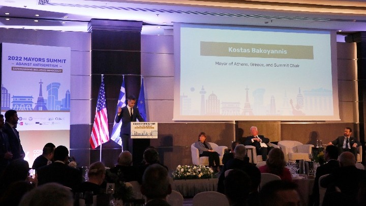 «Η μισαλλοδοξία συνιστά άμεση απειλή για τον δημοκρατικό τρόπο ζωής μας. Δεν έχει καμιά θέση στις κοινωνίες μας γι' αυτό και οφείλουμε να συνεργαστούμε, ώστε να την απομονώσουμε και να την εξαλείψουμε. [..] Σήμερα και αύριο, έχουμε τη μοναδική και πολύτιμη ευκαιρία να μοιραστούμε εμπειρίες και πρακτικές γύρω από την αντιμετώπιση του σημαντικού αυτού ζητήματος Αυτή η Σύνοδος Κορυφής κατά του αντισημιτισμού ας γίνει το έναυσμα, ώστε να προχωρήσουμε σε δράσεις και πρωτοβουλίες μετασχηματισμού και να οικοδομήσουμε τις κοινωνίες μας με μεγαλύτερη ανεκτικότητα και ανθεκτικότητα».    Με τα λόγια αυτά, ο δήμαρχος Αθηναίων, Κώστας Μπακογιάννης καλωσόρισε απόψε στην Αθήνα περισσότερους από 25 δημάρχους από όλο τον κόσμο, που έφτασαν στην ελληνική πρωτεύουσα για να συμμετάσχουν στην Παγκόσμια Σύνοδο Δημάρχων κατά του Αντισημιτισμού -το σημαντικότερο ραντεβού των εκπροσώπων της τοπικής αυτοδιοίκησης, στο πλαίσιο των παγκόσμιων δράσεων κατά του αντισημιτισμού. Η Σύνοδος που συνδιοργανώνεται από τον Δήμο Αθηναίων, τον Οργανισμό Combat Antisemitism Movement (CAM) και το Centre for Jewish Impact, σε συνεργασία με τις Εβραϊκές Ομοσπονδίες της Βόρειας Αμερικής, ξεκίνησε απόψε με το προγραμματισμένο επίσημο δείπνο στο ξενοδοχείο Hyatt, στο οποίο -μεταξύ άλλων- απηύθυναν ομιλίες η Πρόεδρος της Δημοκρατίας, Κατερίνα Σακελλαροπούλου, ο αντιπρόεδρος της κυβέρνησης, Παναγιώτης Πικραμμένος, ο δήμαρχος Αθηναίων, Κώστας Μπακογιάννης και ο δήμαρχος της Νέας Υόρκης, Έρικ 'Ανταμς. Στον χαιρετισμό της, η κ. Σακελλαροπούλου, μεταξύ άλλων, ανέφερε: «Σε μια εποχή που ο αντισημιτισμός διογκώνεται παγκοσμίως, είναι ηθικό καθήκον μας να μετατρέπουμε, καθημερινά, τη μνήμη σε πράξη. Να καλλιεργούμε την ιστορική γνώση. Να αναστοχαζόμαστε τις αιτίες που γέννησαν τον ναζισμό, τον ρατσισμό, τον αντισημιτισμό και κάθε είδους φυλετικές, θρησκευτικές και κοινωνικές προκαταλήψεις. Να εργαζόμαστε με περισυλλογή για την αφύπνιση των συνειδήσεων και τη θωράκιση ενάντια στη ρητορική του μίσους. Να ενισχύουμε την κοινωνική φιλότητα και την αλληλεγγύη. Μόνον έτσι θα αποτραπεί η επανάληψη παρόμοιων εγκλημάτων που αμαυρώνουν τον πολιτισμό μας. Μόνον έτσι δεν θα "ακούσουμε και πάλι ψιθύρους από την κόλαση", όπως χαρακτηριστικά έγραψε ο σπουδαίος στοχαστής Τζορτζ Στάινερ». Ο δήμαρχος Αθηναίων, στην ομιλία του υπογράμμισε επίσης ότι ο ρόλος των τοπικών αρχών είναι καταλυτικός στη μάχη κατά της μισαλλοδοξίας, καθώς η τοπική αυτοδιοίκηση καλείται να ενσωματώσει το αίσθημα των πολιτών και τους αγώνες τους στη διαδικασία λήψης αποφάσεων. Ο κ. Μπακογιάννης, έκανε ιδιαίτερη μνεία στη βαθιά και ουσιαστική σχέση της πόλης των Αθηνών με την εβραϊκή κοινότητα, λέγοντας: «Με ιδιαίτερη υπερηφάνεια υπηρετώ τη σπουδαία πόλη των Αθηνών, μια πόλη εδραιωμένη στις φιλελεύθερες αρχές και αξίες. Εδώ, γεννήθηκε η Δημοκρατία και εδώ από αρχαιοτάτων χρόνων έχουμε στην καρδιά και το μυαλό μας τον ορθό διάλογο, τον διάλογο χωρίς αποκλεισμούς. Ταυτόχρονα, η Αθήνα είναι η πόλη, η οποία καλλιέργησε επί χιλιάδες χρόνια, βαθιές και ουσιαστικές σχέσεις με την ισραηλιτική κοινότητα. Μέχρι και σήμερα. Είμαι περήφανος, διότι η Αθήνα ήταν πάντα και παραμένει σύμμαχος της ανεκτικότητας, της προσωπικής ελευθερίας και της ασφάλειας για όλες και όλους». Στο πλαίσιο της Συνόδου, ο κ. Μπακογιάννης, απένειμε τιμητική πλακέτα -εκ μέρους των δ