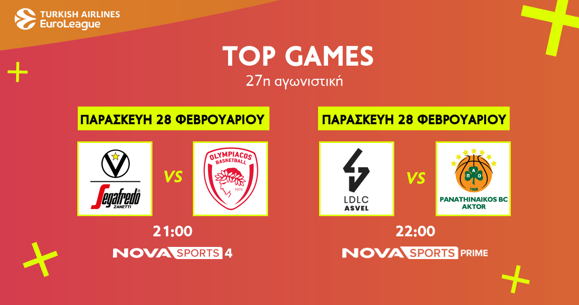 Η EuroLeague η κορυφαία ευρωπαϊκή διασυλλογική διοργάνωση στο χώρο του μπάσκετ, επιστρέφει στην αγωνιστική δράση μετά από διακοπή δύο εβδομάδων και οι συνδρομητές της Nova ετοιμάζονται να απολαύσουν τις αναμετρήσεις της 27ς αγωνιστικής Βίρτους Μπολόνια – Ολυμπιακός (28/2, 21:00), Βιλερμπάν – Παναθηναϊκός AKTOR (28/2, 22:00).