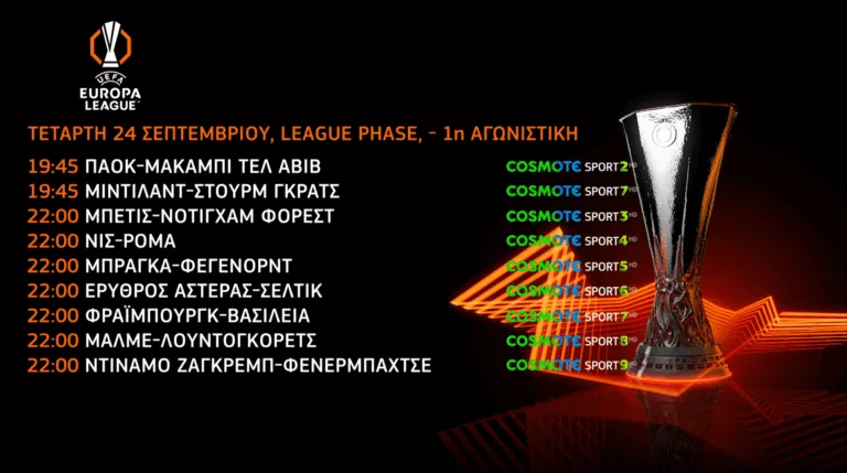 Η League Phase του UEFA Europa League ξεκινά το διήμερο 24-25/9, με τον Παναθηναϊκό και τον ΠΑΟΚ να δίνουν τις πρώτες τους αναμετρήσεις στην COSMOTE TV. Πρώτος στη «μάχη» θα ριχτεί ο «δικέφαλος του βορρά», ο οποίος την Τετάρτη 24/9 (19:45, COSMOTE SPORT 2HD) θα υποδεχθεί στην «Τούμπα» τη Μακάμπι Τελ Αβίβ. Την Πέμπτη 25/9 (22:00, COSMOTE SPORT 2HD & 4K) θα ακολουθήσει ο αγώνας του «τριφυλλιού» στη Βέρνη της Ελβετίας, εναντίον της Γιανγκ Μπόις. Η δημοσιογραφική ομάδα των καναλιών COSMOTE SPORT θα μεταφέρει όλες τις εξελίξεις της 1ης αγωνιστικής, μέσα από ειδικές εκπομπές και πλούσια ρεπορτάζ.