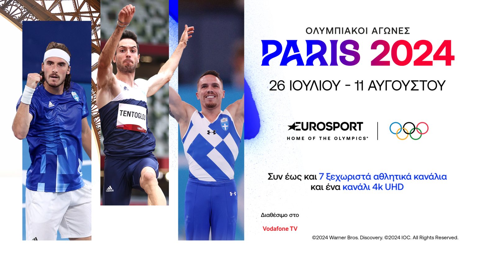 Oι Ολυμπιακοί Αγώνες Παρίσι 2024, το πιο ιστορικό αθλητικό γεγονός, έρχεται ζωντανά στο Vodafone TV μέσω 7+1 ειδικών pop-up καναλιών από το κανάλι Eurosport που προσφέρει πάνω από 820 ώρες συναρπαστικής αθλητικής δράσης.