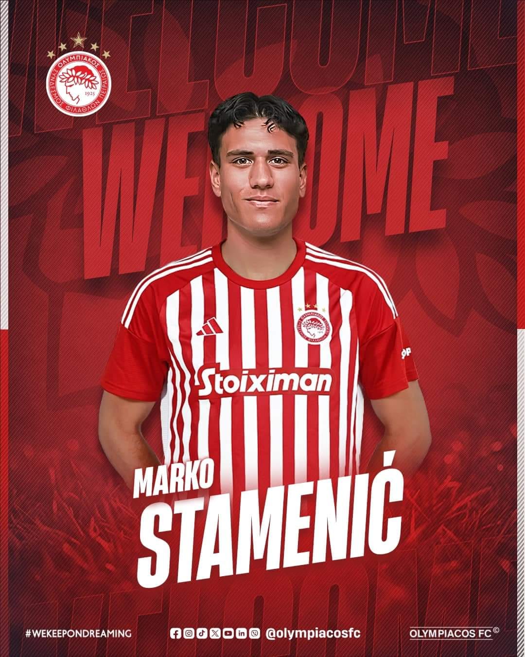 «Η ΠΑΕ Ολυμπιακός ανακοινώνει την απόκτηση του 22χρονου μέσου, Μάρκο Στάμενιτς. Γεννημένος στις 19 Φεβρουαρίου 2002, στο Wellington, με καταγωγή από τη Σερβία, είναι 15 φορές διεθνής με την εθνική ομάδα της Νέας Ζηλανδίας.