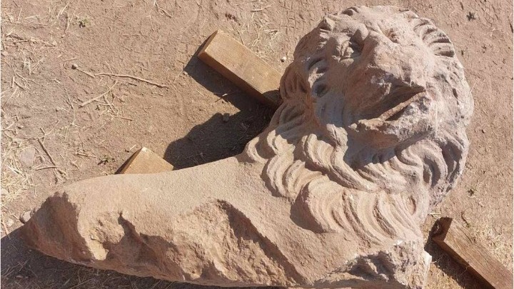 Κατά την ανασκαφή του νότιου decumanus εντοπίστηκε, σε πολύ καλή κατάσταση, τμήμα μαρμάρινου λέοντα μεγάλων διαστάσεων. Συγκεκριμένα, σώζεται ακέραια η κεφαλή του, με την πλούσια κώμη του, και τμήμα του λαιμού και του σώματός του. Η κεφαλή είναι στραμμένη προς τη δεξιά πλευρά του. Τα χαρακτηριστικά της κεφαλής του λέοντα σώζονται σε άριστη κατάσταση.