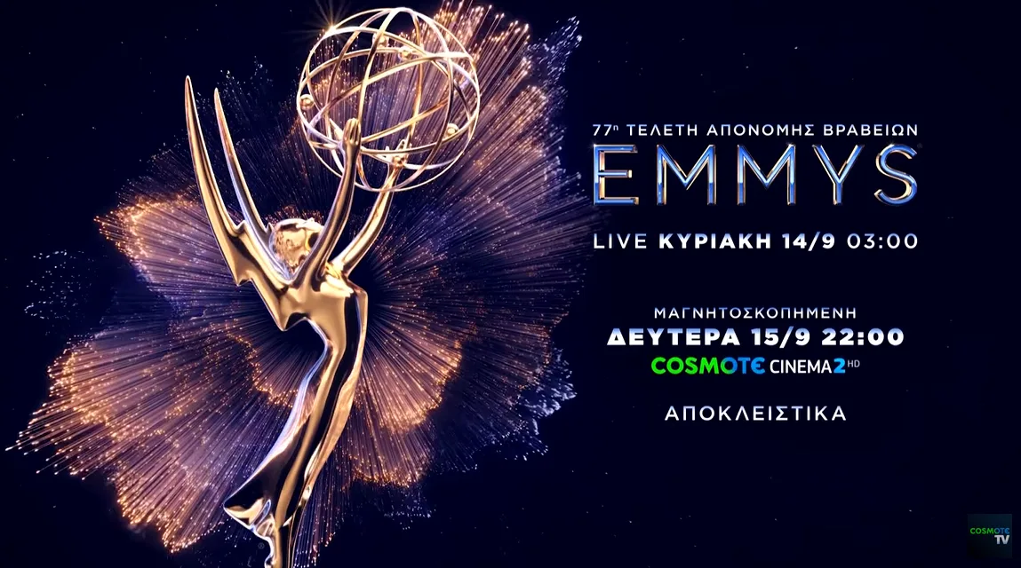 Η 77η τελετή απονομής των βραβείων Emmy, ένας από τους μεγαλύτερους τηλεοπτικούς θεσμούς παγκοσμίως, που τιμά τις καλύτερες ερμηνείες και σειρές που ξεχωρίζουν κάθε χρόνο στη «μικρή οθόνη», έρχεται ζωντανά και αποκλειστικά στην COSMOTE TV. Η λαμπερή βραδιά θα μεταδοθεί με πρωτότυπο ήχο, την Κυριακή 14/9 στις 03.00 (ξημερώματα Δευτέρας 15/9) στο COSMOTE CINEMA 2HD, σε σχολιασμό της Ιωσηφίνας Γριβέα. Το βράδυ της Δευτέρας (15/9) στις 22.00, θα ακολουθήσει στο ίδιο κανάλι, η μετάδοση της τελετής με ελληνικούς υπότιτλους, η οποία θα είναι διαθέσιμη και on Demand.
