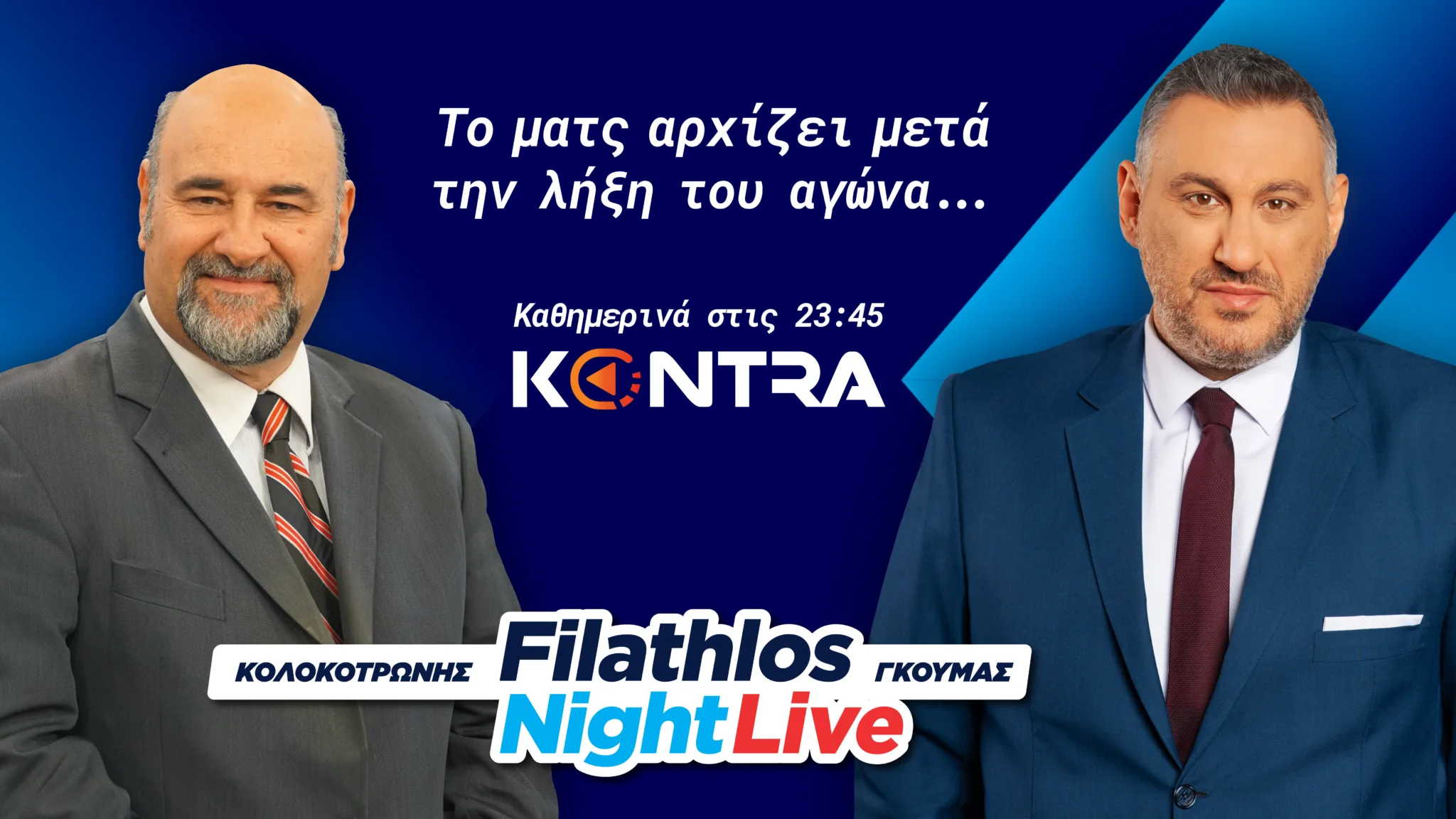 Από τη νέα σεζόν, η αθλητική φωνή του Kontra, η εκπομπή “Filathlos Night Live” με τον Γιώργο Κολοκοτρώνη και τον Ηλία Γκούμα, αποκτά νέο ραντεβού με τους φιλάθλους: κάθε βράδυ στις 23:45, αμέσως μετά το τέλος των μεγάλων ευρωπαϊκών αναμετρήσεων.